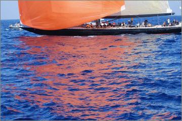 Inmitten des Feldes die berühmte J-Class-Yacht Shamrock V, immer wieder gern gesehener Gigant bei den Regatten... aber auch sie ist auf Wind beim Segeln angewiesen. Und dann endlich Wind genug, dass die Boote sich auch ihrem Zweck entsprechend fortbewegen können. Dabei sind die Vorm-Wind-Kurse bei den modernen Yachten schon allein wegen ihrer meist sehr farbenfrohen Spinnaker ein faszinierendes Farbspaktakel.