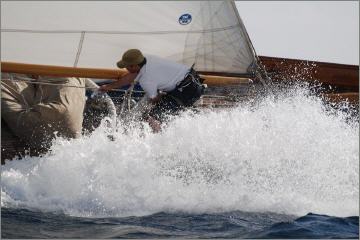 Die Avel, ein Traum von Boot und gut an ihrem roten Unterwasserschiff und dem sogenannten Klippersteven mit der charakteristischen negativen Krümmung zu erkennen. Das Boot gehört wie die Creole den beiden Gucci-Schwestern Alexandra und Allegra, die mit der Jacht an vielen Regatten aktiv und erfolgreich teilnehmen. Das Boot hat eine sehr motivierte Crew, die es auch mit viel Enthusiasmus und Liebe zum Detail in Fahrt halten. Charakteristisch das Crew-Outfit, ganz in weiß, mit einem orangefarbenen Halstuch.