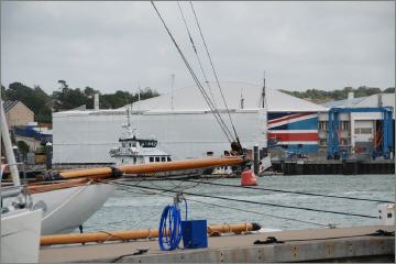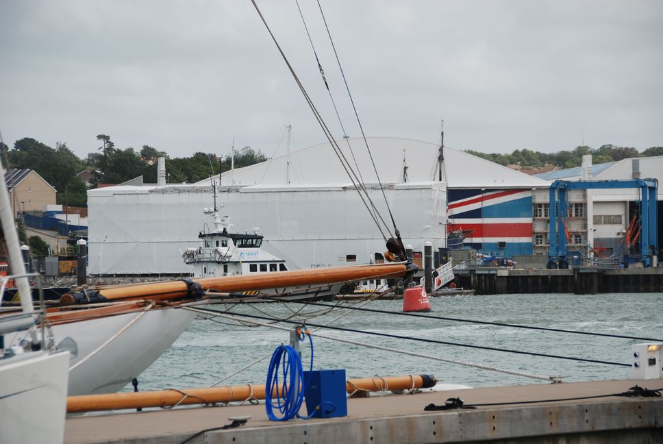 Replika, liegt zur Zeit (2012) in Cowes auf einer Werft zum Ausbau des Rumpfes. Das Foto zeigt den Liegeplatz mit dem Gerüst rund um die Jacht zum Schutz vor der Witterung.